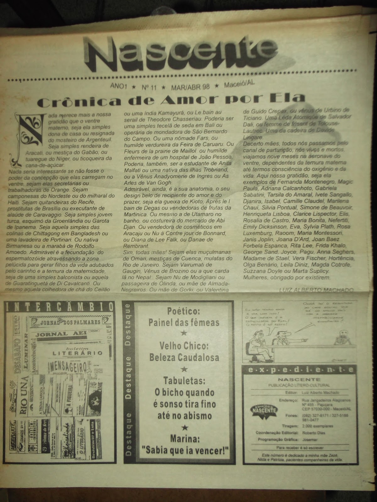 VAMOS APRUMAR A CONVERSA? NASCENTE – A edição nº 11 do tabloide Nascente, de mar/abr-1998, traz como editorial o poema Crônica de amor por ela. Na seção Bate Papo, uma entrevista com Marina Lima. Na seção Tabuletas, o quarto episódio das Proezas do Biritoaldo: Quando o bicho é sonso tira fino até na beira do abismo. Traz uma entrevista com a escritora alagoana Arriete Vilela, uma charge do Zinei e uma matéria sobre o Velho Chico: beleza caudalosa. Na seção Intercâmbio todo material recebido da seção Registro: o Slan Quinze, editado pelo Rovel; o Dicionário Bibliográfico de Escritores Brasileiro, do Adrião Neto (PI); o Postal Clube, de Araci Barreto Costa (RJ); o informativo Rio Una da Fundação Casa da Cultura Hermilo Borba Filho (PE), o Tom Zine (MG), os livros com as peças teatrais Complexos, Vendaval no Paraíso e Lua de Sangue sobre o vale, do poeta e teatrólogo Pedro Onofre; e na seção Nascente Poético poemas de Arriete Vilela (AL), Lau Siqueira (PB), Marina Fátima Dias (MS), Nilza Menezes (RO), Eva Reis (MG), Claudio Cernov (SP), Maria Cardoso Zurto (RS), Sumara Cadoso (PA), Zenilda N. Lins (SC), Laís Costa Velho (RJ), Denise Teixeira Viana (RJ), Arita Damasceno Pettená (SP), Jocedyr Tavares (RJ), Josenilda Pereira (PW), Eliane di Santi (SP) e o destaque para o poema Painel das Fêmeas, com uma homenagem pela passagem do aniversário de Tereza Collor. Veja mais aqui e aqui.